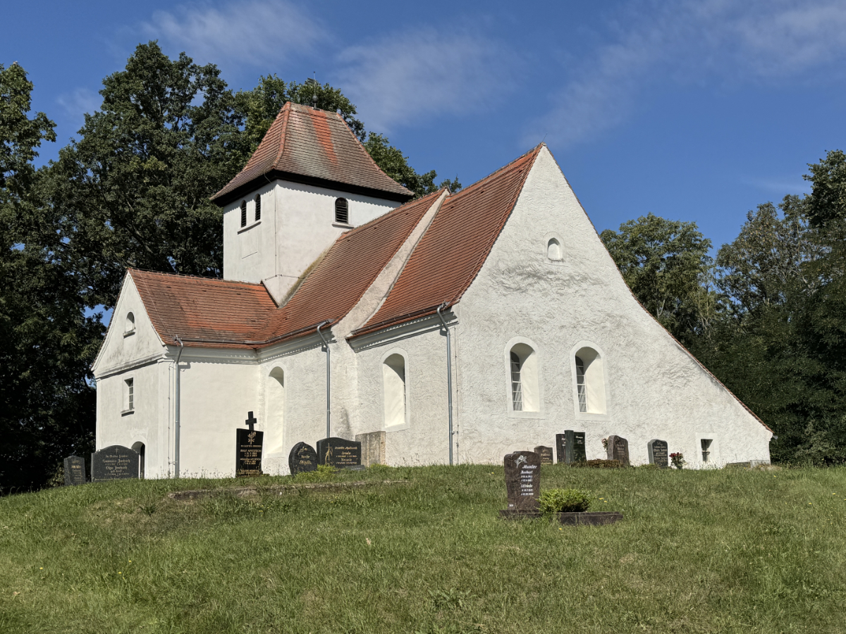 Das uralte Kirchlein, versteckt hinter Bäumen, lässt kaum jemanden unberührt. Verlässlich hat es bislang seine Pforte nur zweimal im Jahr geöffnet, dann aber sind zu später Stunde viele gekommen, die im Kerzenschein singen und den Geheimnissen der Christ- und Osternacht lauschen wollen. Die Kirche steht auf einem künstlich aufgeschütteten Siedlungshügel der slawischen Zeit, darauf, so kann vermutet werden, stand ein befestigter Hof, der schon im 11. Jahrhundert eine „Eigenkirche“ des dort ansässigen Herrn besessen hat. In die frühe Zeit weisen der Triumphbogen und zwei zugesetzte romanische Fenster. In der spätromanischen Zeit des 12. und 13. Jahrhunderts wurde vermutlich die nördliche Sakristei angebaut, die ein Tonnengewölbe und eine „Piscina“ – eine Ausgussöffnung für die bei der Messfeier erfolgten Waschungen – enthält. Der 30jährige Krieg muss auch dieses Kirchlein in Mitleidenschaft gezogen haben, und es dauerte lange, bis es endlich zu der notwendigen Wiederherstellung kam. Im Jahr 1689, so heißt es nach der Chronik von Jeremias Simon, wurde der südliche Vorbau mit dem Haupteingang errichtet, ebenso vermutlich erst zu dieser Zeit der Turm. Weiter wurden ein neuer Altar und Kanzel eingebaut, die unter den nächsten Generationen mehrfach überarbeitet und verändert wurden.