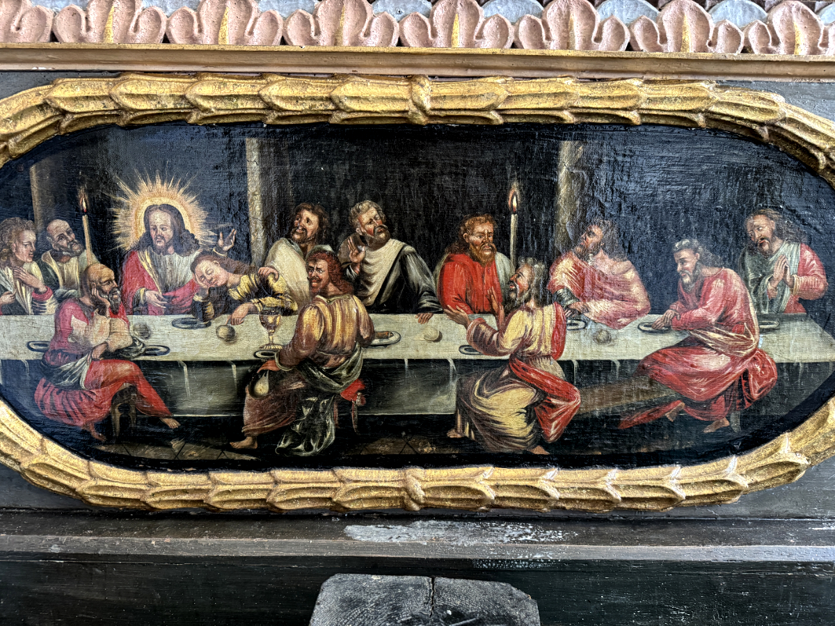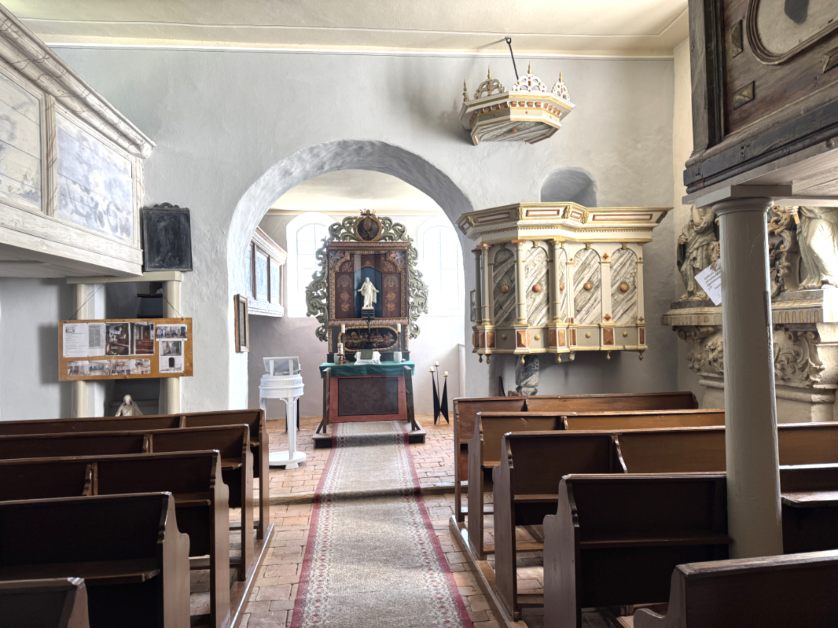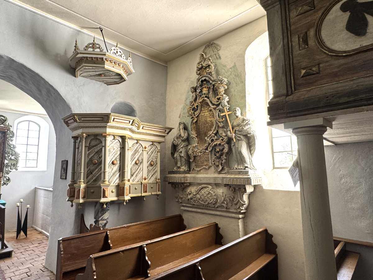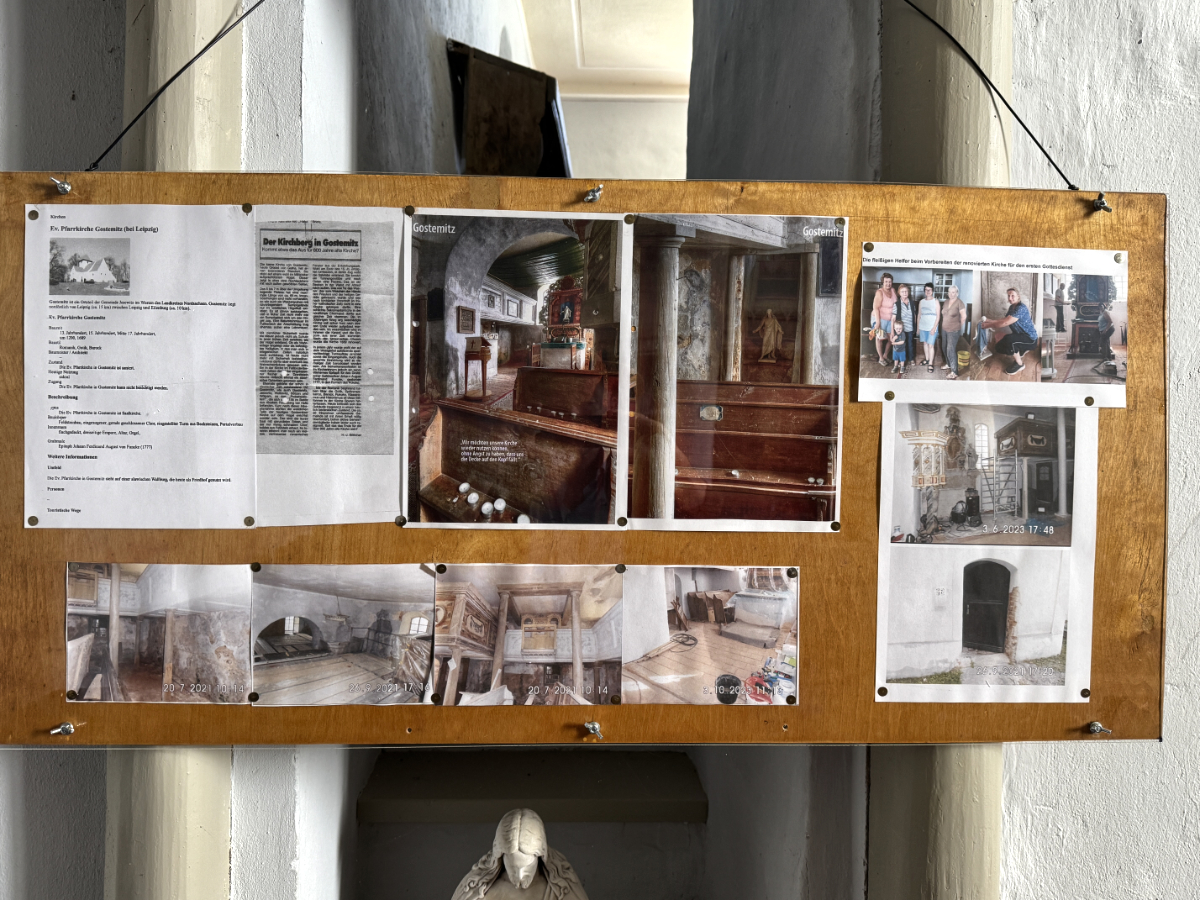 Der Platzmangel hat in dieser Kirche immer wieder kreative Lösungen hervorgebracht. Geheimnisvoll wirken die beiden schmalen Treppenaufgänge, die das Kirchenschiff hin zum Kirchenchor durchschneiden, so dass man vom Chor auf die kirchenseitige Kanzel und andersherum auf die chorseitige Empore gelangen kann. Die Schrickel-Orgel besitzt einen Blasebalg, der ungewöhnlicherweise mit der Hand gezogen werden muss. Und auf die Nordempore gelangt man nur, indem man die Orgel auf deren Rückseite umgeht. Schließlich hat man auch einmal die Bänke in den Gang hinein verlängert, damit mehr Sitzplätze geschaffen werden. In den letzten Jahren häuften sich die Mängel an: Algen wuchsen an den Mauern, Holzteile zerfielen, durch Diebstahl verschwand unter anderem eine Gedenktafel und eine große Anzahl Orgelpfeifen. Aber selbst für die einfachsten Reparaturen fehlten der winzigen Kirchgemeinde die nötigen finanzielle Mittel. Zuletzt bröckelte der Putz von der Chordecke und musste mit einer Plane abgeschirmt werden. Dann aber entdeckte die Deutsche Denkmalstiftung die Gostemitzer Kirche als eine „Kostbarkeit“, andere Unterstützer wie der Freistaat Sachsen, die KIBA-Stiftung und die Ostdeutsche Sparkassenstiftung konnten gewonnen werden und der Kirchenkreis und der Denkmalschutz unterstützten die Arbeiten nach Leibeskräften. Seit 2021 wurden nun also Kanzel und Epitaph notgesichert, kaputte Teile ergänzt, eine alte Weihetafel restauriert, Algen entfernt, alte Malereien freigelegt, Putze erneuert, die Orgel spielfähig und schick restauriert, das Gestühl und der Fußboden repariert und die Fenster erneuert. Die Maßnahmen sind, während ich diese Zeilen schreibe, noch nicht ganz abgeschlossen, stehen aber kurz vor der Fertigstellung. Unsere Hoffnung ist also, dass in der Osternacht die Gostemitzer Glocke wieder erklingen darf und die Besucher den lange verstummten Klängen der Orgel lauschen und den besonderen Zauber dieser Kirche in sich aufnehmen können. (fk)