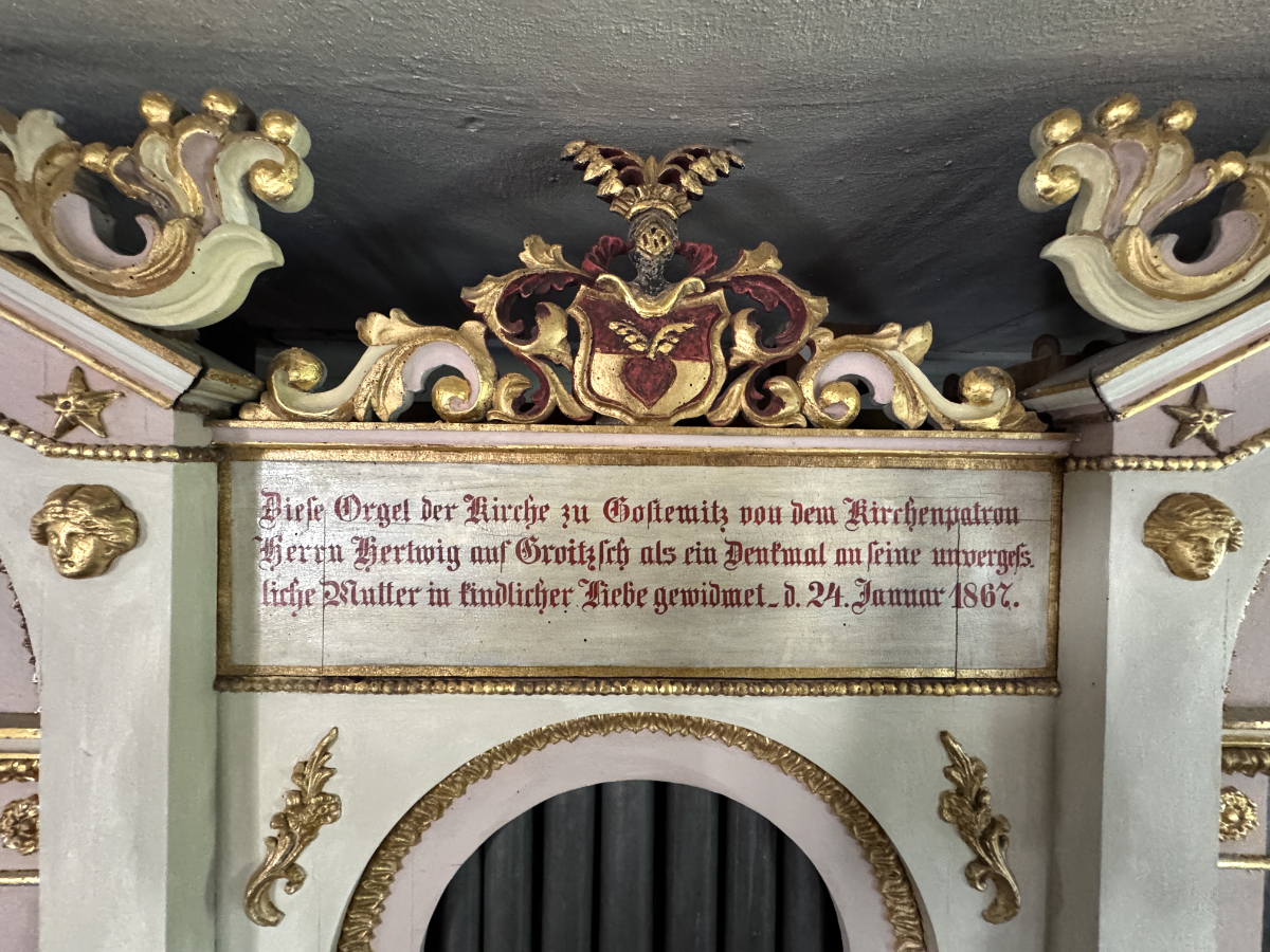 Die Herren Hertwig von Groitzsch waren zu jener Zeit die Patrone der Kirche. Einer von ihnen heiratete eine Gostemitzerin, deren Sohn die Orgel 1866 zu ihrem Andenken stiftete. Deshalb ziert auch das Wappen der Familie die Spitze des Orgelprospektes. Schrickel, der den Auftrag erhalten hatte, baute innerhalb eines Jahres das Instrument. Der Eilenburger Orgelbauer hatte einst bei Ludwig Weineck gelernt und sich 1845 in der Torgauer Straße selbständig gemacht hatte.