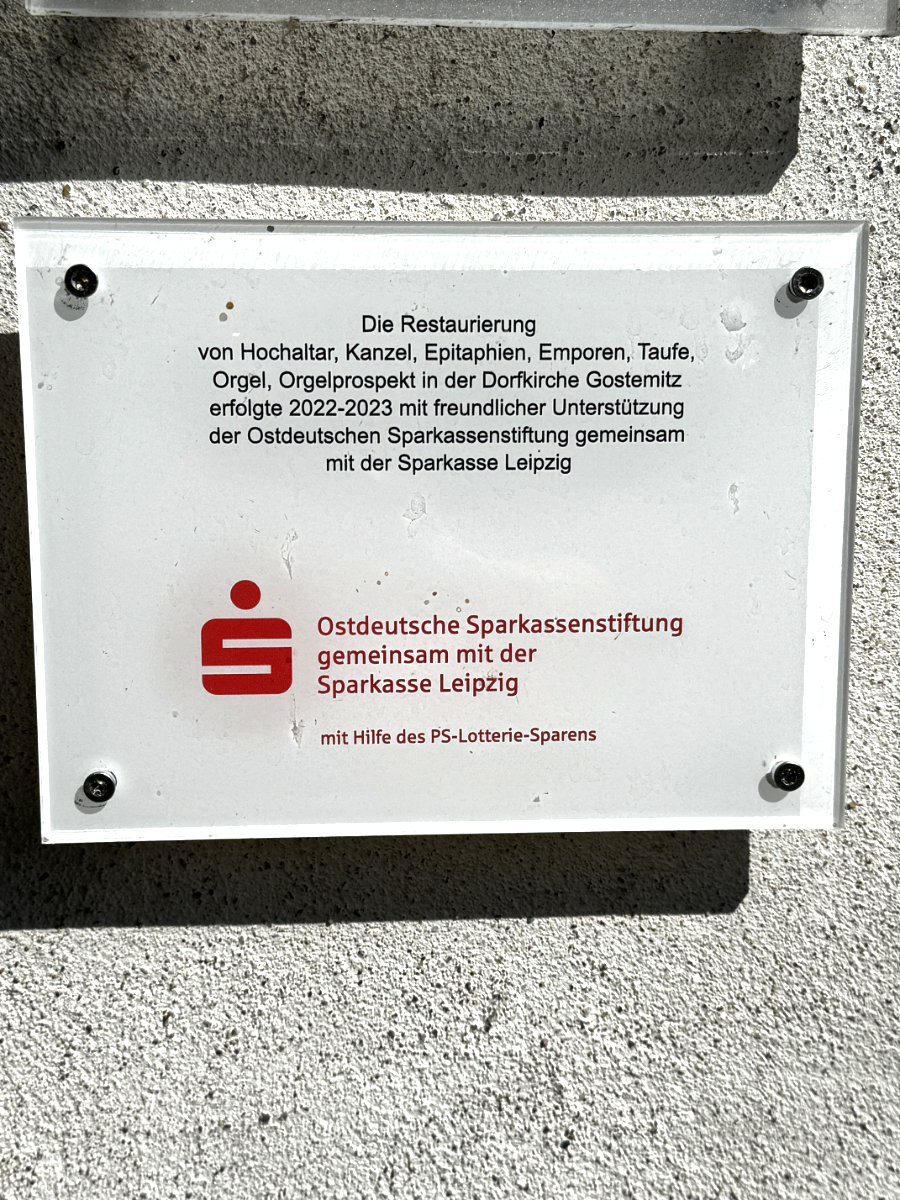 Nach den langjährigen Baumaßnahmen an der rund 800jährigen Gostemitzer Kirche ist die Sanierung und Restaurierung der wertvollen Inneneinrichtung (wie das überaus bemerkenswerte Barock-Epitaph der Familie Funke, die seltene minimalistische Schrickel-Orgel, der Altar) nun endlich abgeschlossen. Die Kirche erstrahlt dank vieler Helfer und dem Engagement der Leipziger Sparkassen-Stiftung, der Deutschen Denkmalstiftung, der Kirchenbaustiftung und des Denkmalschutzes in einem ganz besonderen Glanz.