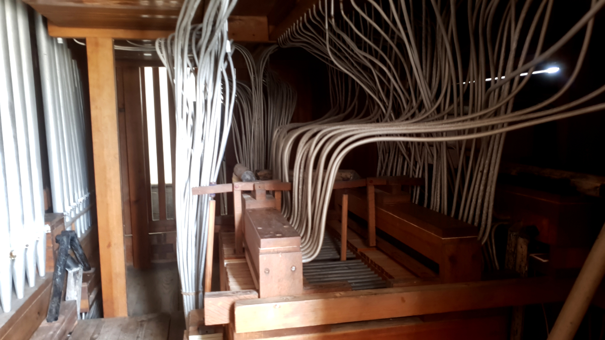 Am Spieltisch finden sich sage und schreibe sechs Koppelregister - ein deutlicher Hinweis, dass es sich um eine pneumatische Orgel handelt. Bei diesem von Rühlmann bevorzugten Orgeltyp dient die vom Doppelfaltenbalg erzeugte Luft nicht nur der Klangerzeugung, sondern durch bündelweise Druckleitungen auch der Übermittlung der Ton- und Koppeltrakturen. Diese seit 1870 eingesetzte Bauweise hat gegenüber den mechanischen Trakturen den Vorteil einer unglaublich leichten Spielweise, so dass man die Orgeln nicht mehr „schlagen" musste.