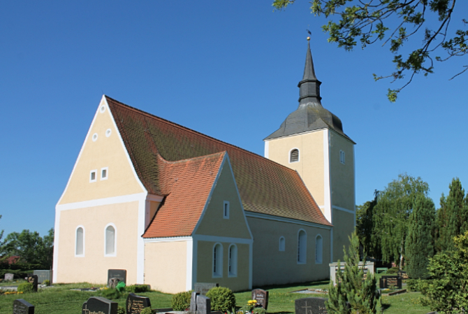 Jahre nach dieser Katastrophe baute man das Pfarrhaus und die Scheune wieder auf. Aus dem Metall der vom Brand zerstörten Glocken wurden 1653 von Meister Peter Stengler in der Rotgießerei Leipzig zwei neue Glocken gegossen und auf einem Glockenstuhl aufgehängt. Die Kirche ist von 1658 - 1660 wieder aufgebaut wurden. Das nötige Geld kam aus sechs Diözesen und das nötige Holz wurde von Kurfürst Johann Georg aus den sächsischen Wäldern bewilligt. Weitere zehn Jahre später wurde der Turm von Meister Andreas Rauchfußen (Eilenburg) höher gebaut und erhielt seine noch heute weithin sichtbare Haube. Die Glocken fanden endlich wieder Platz im Turm. Die Eindeckung des Turmes mit Schiefer übernahm Meister Samuel Burckhard aus Torgau, den Knopf mit Fahne und Stern hat Meister Georg Gollwitz, ein Kupferschmied aus Eilenburg, gefertigt. Die Uhr wurde wieder hergerichtet, Altar, Predigtstuhl und Taufstein wurden von einem Kunstmaler aus Eilenburg bemalt. 1681 ist die obere Decke in der Kirche gemalt wurden. In alten Unterlagen findet sich die Nachricht vom Kauf eines neuen Orgelwerks 1684. 1727 wird die Orgel durch eine neue ersetzt.